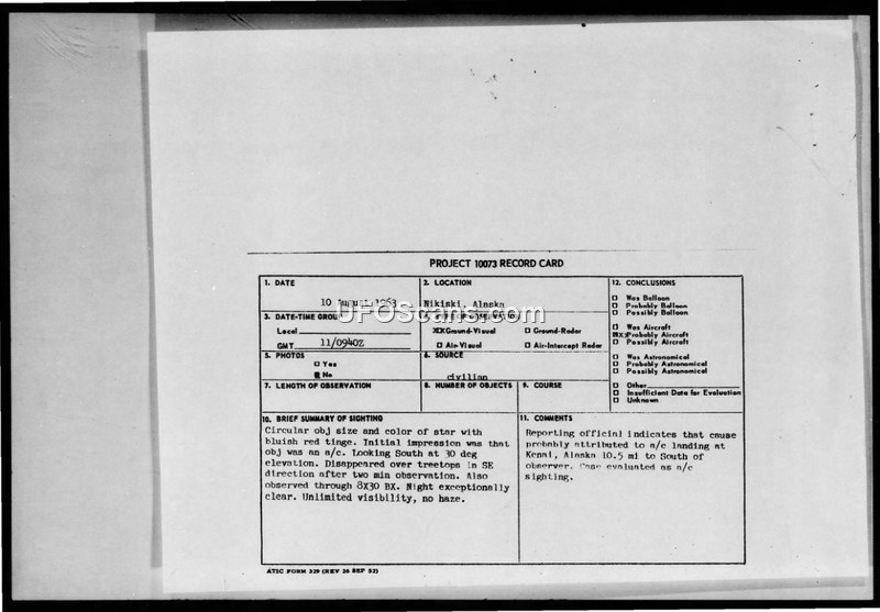 PROJECT 10073 RECORD CARD — Nikiski, Alaska, 10 August 1963