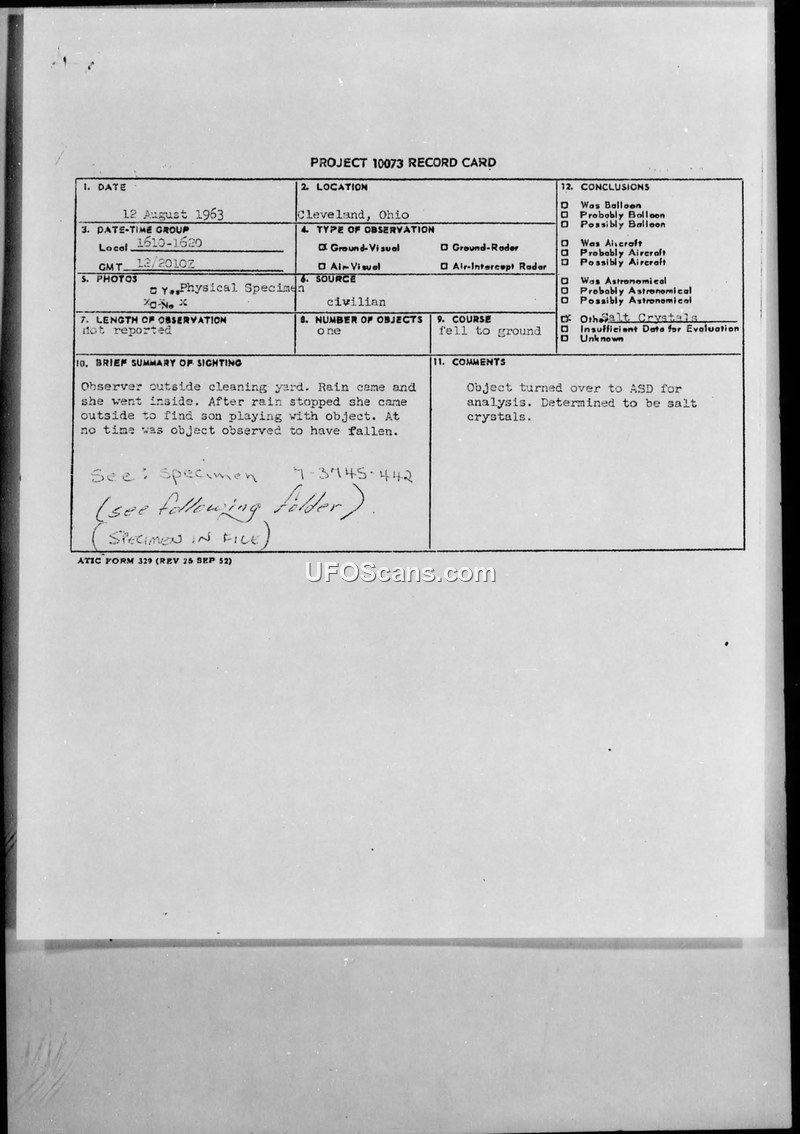 A physical object found in Cleveland, Ohio, on August 12, 1963, was analyzed by the Air Force's Aeronautical Systems Division. The laboratory identified the object as salt crystals (sodium chloride).