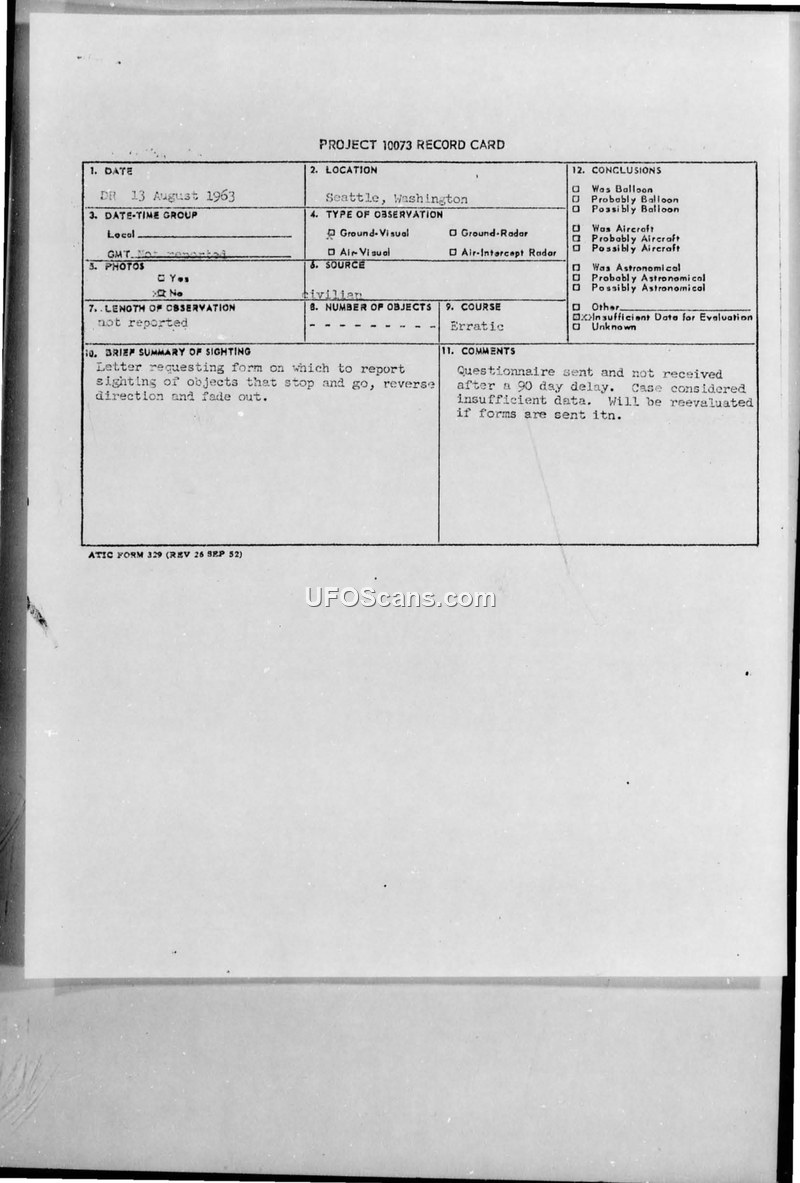 Project 10073 Record Card — Seattle, Washington, 13 August 1963
