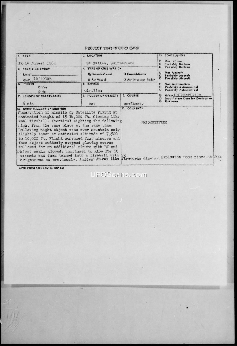 The sighting in St. Gallen, Switzerland, was reported as a missile or satellite that glowed, stopped, and eventually burst like fireworks. The case remains unidentified.