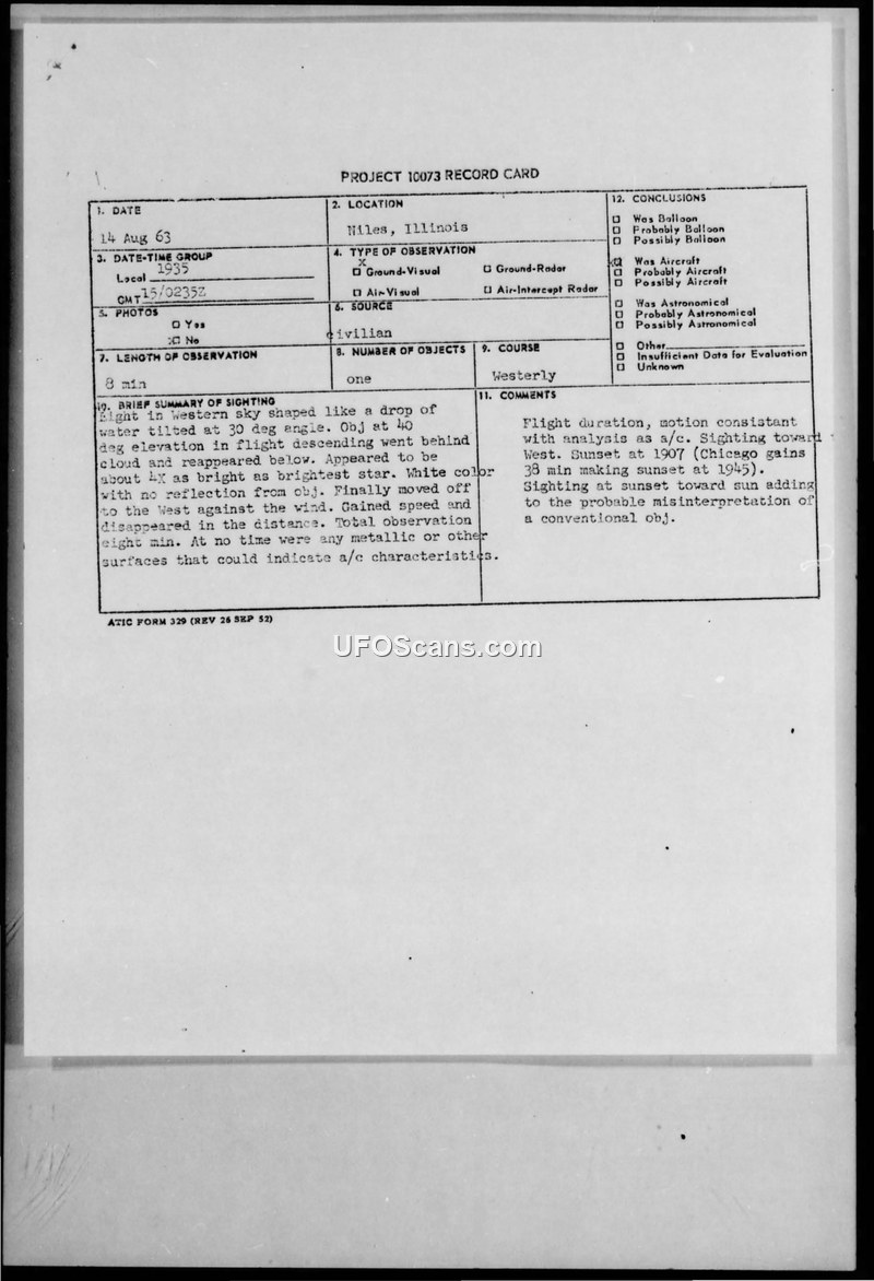 A civilian report of a white, water-drop-shaped object observed in Illinois on August 14, 1963. The Air Force concluded the sighting was likely a misinterpretation of a conventional object due to sunset lighting conditions.