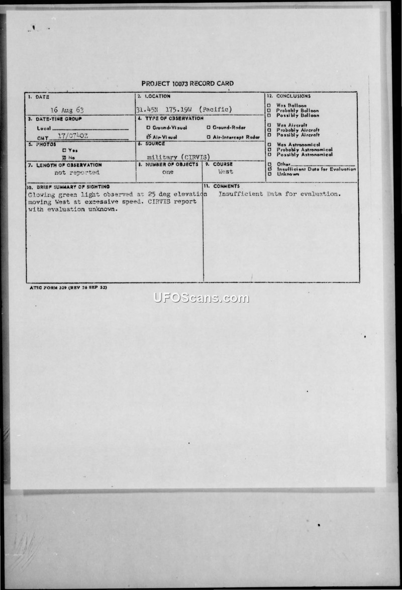 On August 16, 1963, at 170740Z, a military CIRVIS report was filed regarding an unidentified aerial phenomenon observed in the Pacific region at coordinates 31.45N 175.19W. The witness reported observing a glowing green light at a 25-degree elevation, which was traveling in a westerly direction at an excessive speed. The incident was documented on a Project 10073 record card and subsequently transmitted via military staff message channels, including communications between COMBARPAC and various commands such as CINCPACAF, CINCNORAD, and the Department of the Air Force. The report was also shared with the CIA and DIA. Despite the formal reporting process, the official conclusion recorded by ATIC was that there was insufficient data available to conduct a proper evaluation of the sighting.