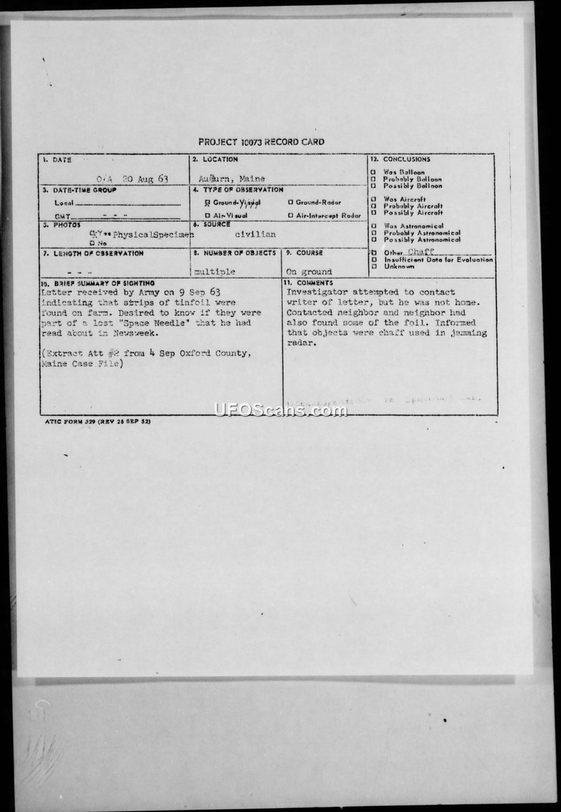Project 10073 Record Card — Auburn, Maine, 20 Aug 63