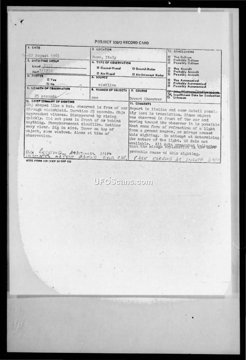 Project 10073 Record Card — Sighting Incident, Rome, Italy, 20-22 August 1963