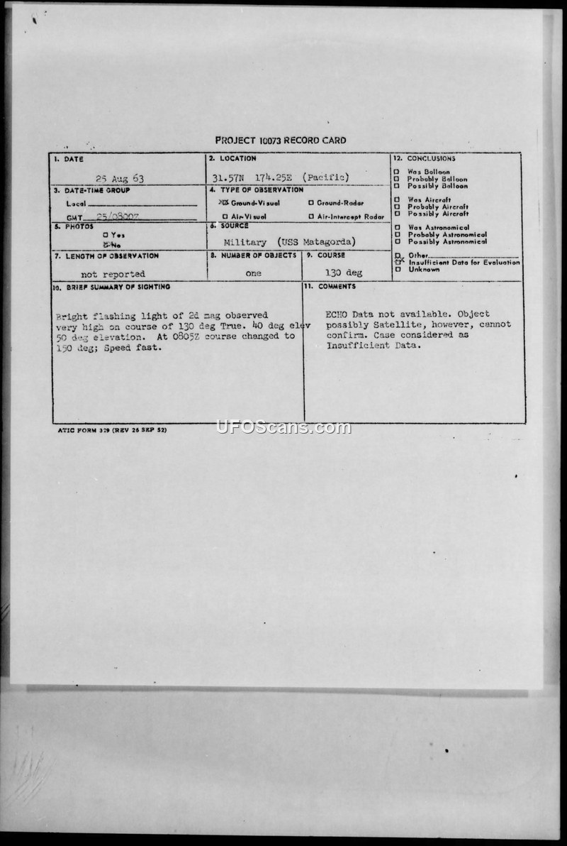 On August 25, 1963, the crew of the USS Matagorda observed an unidentified aerial phenomenon in the Pacific region at coordinates 31.57N 174.25E. The object was described as a bright, flashing white light, comparable in brightness to a second-magnitude star. It was observed at a very high altitude, initially traveling on a course of 130 degrees True, before changing its course to 150 degrees at a fast speed. The weather conditions at the time were reported as sea calm with scattered clouds. The incident was formally recorded on a Project 10073 record card and disseminated via military staff messages to various commands, including NORAD, CINCPACFLT, and intelligence agencies such as the CIA and DIA. Official evaluation by the Air Technical Intelligence Center (ATIC) noted that radar (ECHO) data was unavailable for the sighting. While the report suggested the object could potentially be a satellite, the lack of corroborating data resulted in the case being officially categorized as having insufficient data for a definitive conclusion.