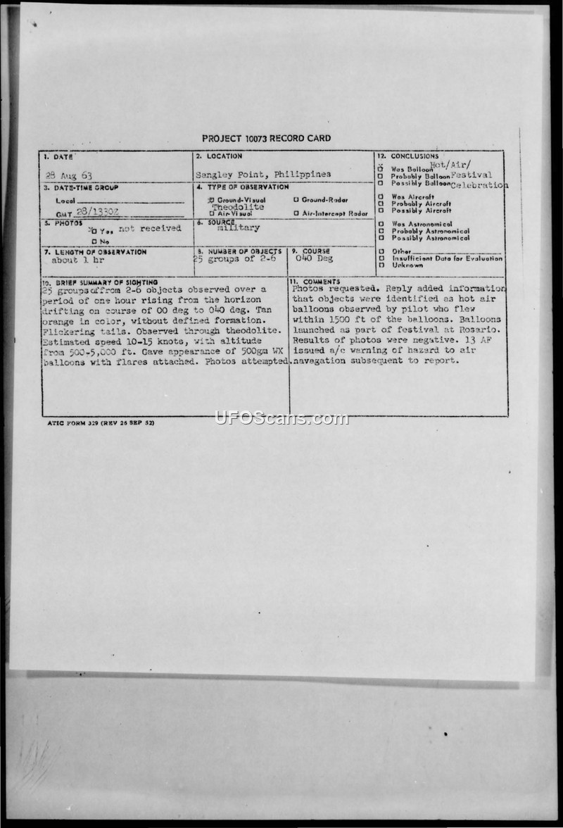 On August 28, 1963, at approximately 1330Z, personnel at Sangley Point, Philippines, including the Commanding Officer, observed 25 groups of 2-6 unidentified objects. The objects were described as tan-orange, round, and lacking a defined formation, exhibiting flickering tails. They were observed rising from the horizon, drifting on a course between 00 and 040 degrees at an estimated speed of 10-15 knots and an altitude ranging from 500 to 5,000 feet. The observation lasted for approximately one hour. The objects were tracked using a theodolite. Although photographs were attempted, the results were negative. Subsequent investigation by the 13th Air Force, which included reports from a Patrol Squadron Forty pilot who flew within 1,500 feet of the objects, determined that they were hot air balloons with lighted flares attached. These balloons were identified as having been launched as part of a festival in the barrio of Rosario, near Sangley Point. Following this positive identification, the 13th Air Force issued a local warning regarding the hazard to air navigation and closed the incident.