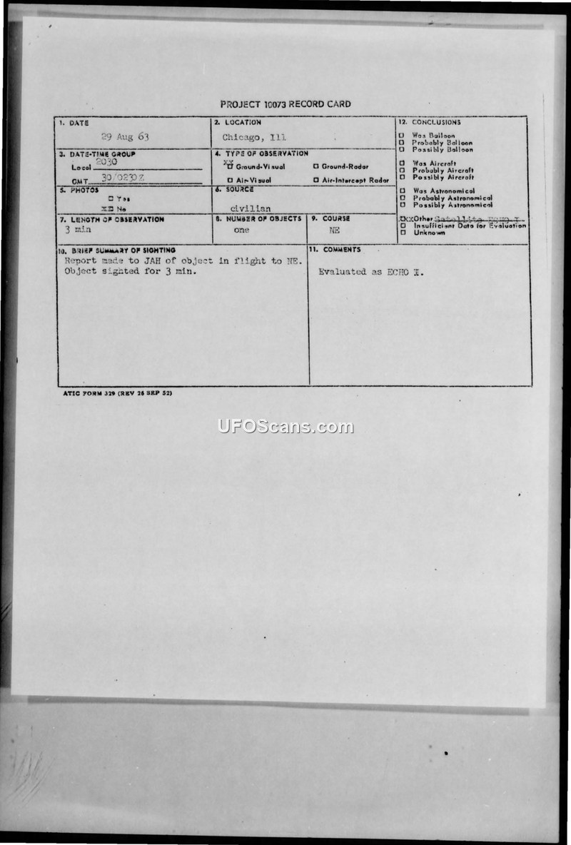 Project 10073 Record Card — Chicago, Illinois, 29 August 1963