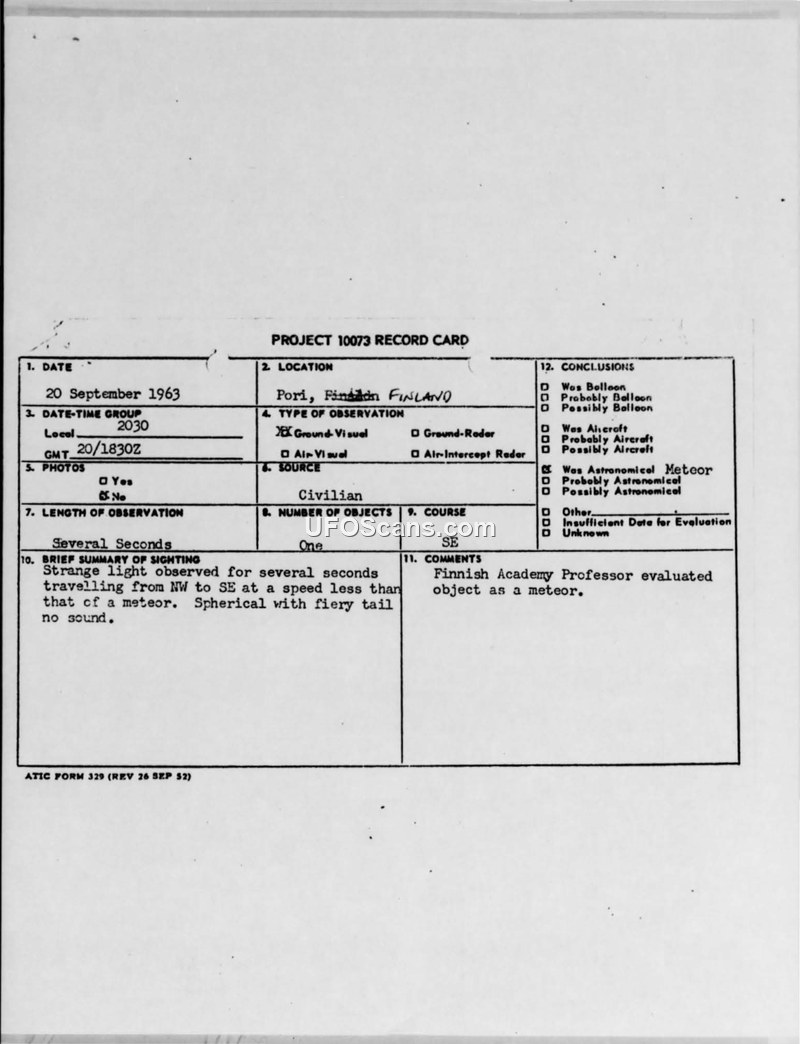 On 20 September 1963, at approximately 2030 hours, a civilian witness in Pori, Finland, observed a strange light in the sky. The object was described as spherical with a fiery tail, traveling from the northwest to the southeast. The witness reported that the object moved at a speed slower than that of a typical meteor and produced no sound. The observation lasted for several seconds. The incident was subsequently reported in the newspaper 'Helsingin Sanomat'. Professor Yrjö Väisälä, a member of the Finnish Academy, was consulted regarding the phenomenon. He declined to comment specifically on the 'flying saucer' aspect but explained that meteors are often seen for several seconds and can sometimes appear ball-shaped with a clear tail. The official conclusion recorded on the Project 10073 record card is that the object was an astronomical meteor. An Air Intelligence Information Report (IR-190-51) authored by Lt Col Howard T. Van De Car notes that while the professor's explanation is likely correct, there was a notable coincidence in the descriptions of objects reported from Pori and Mikkeli, both of which were described as circular or spherical and traveling in a northeast to southeast direction.