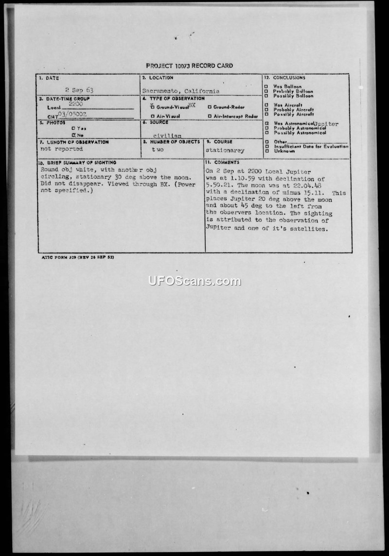 On September 2, 1963, at 2200 hours local time, a civilian witness in Sacramento, California, reported observing two round, white objects. The witness described the objects as appearing the size of a dime, circling, and remaining stationary approximately 30 degrees above the moon. The observation was made using binoculars (referred to as 'BX' in the record card). The sighting was reported to the Air Force, specifically involving Mather Air Force Base, and was processed under Project 10073. The official military evaluation concluded that the objects were not unidentified, but rather the planet Jupiter and one of its satellites. The evaluation was based on astronomical calculations for the date and time, which placed Jupiter 20 degrees above the moon and 45 degrees to the left of the observer's position. The report was formally transmitted via an incoming Air Force message (5200P-I 1467) on September 4, 1963, citing compliance with Air Force Regulation 200-2.