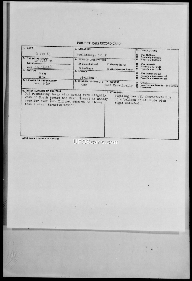 A civilian reported a moving light in the sky over Healdsburg, California, in September 1963. The Air Force investigated the report and concluded the object was likely an upper-air balloon or radiosonde.