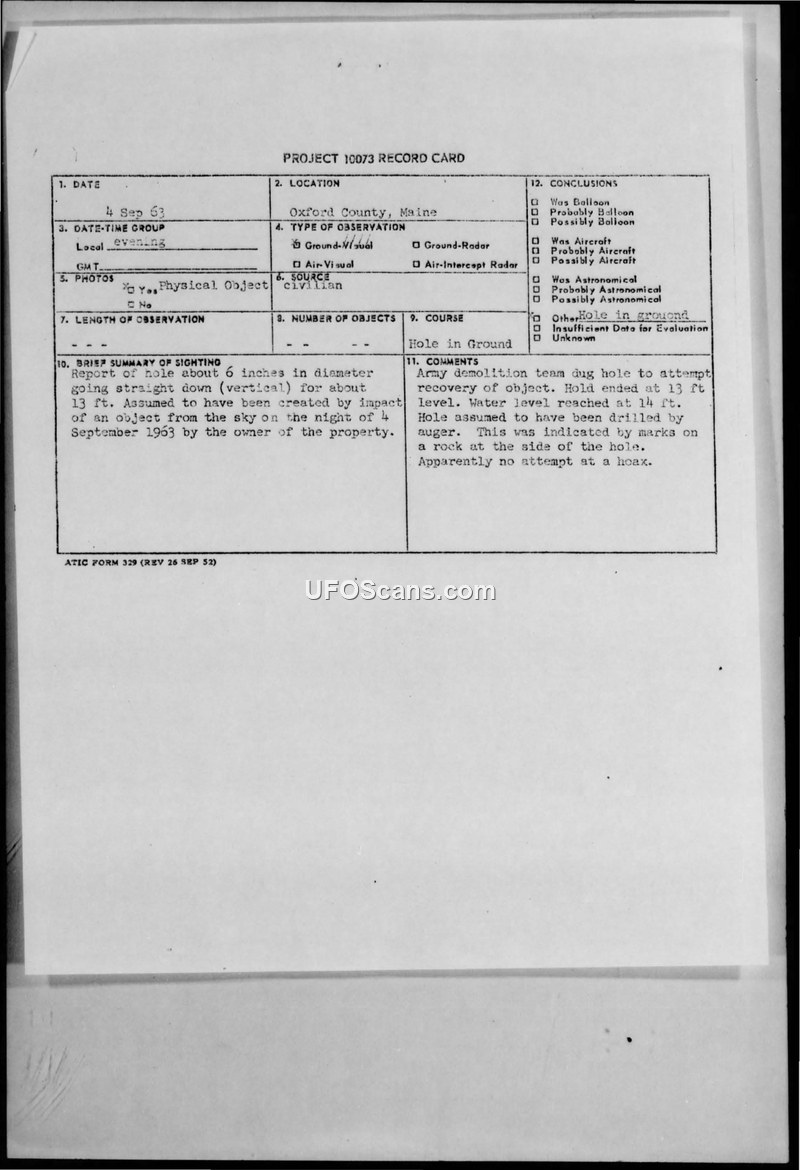 This document is a Project 10073 record card detailing an investigation into a hole discovered in Oxford County, Maine, on the evening of September 4, 1963. The report describes a hole approximately 6 inches in diameter that extended vertically into the ground for 13 feet. The property owner reported that the hole was created by the impact of an object from the sky. An Army demolition team was dispatched to the site to attempt a recovery of the object. Upon investigation, the team determined that the hole ended at the 13-foot level, with water reaching the 14-foot level. The investigators concluded that the hole was likely drilled by an auger, citing marks found on a rock at the side of the hole as evidence. The report explicitly states that there was apparently no attempt at a hoax. The case file includes six 8x10 photographs documenting the site.