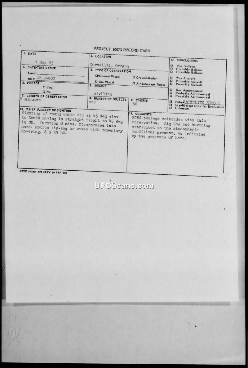 A 1963 UFO sighting in Corvallis, Oregon, was investigated by the Air Force and officially identified as the ECHO satellite. The erratic movement reported by the witnesses was attributed to atmospheric haze.