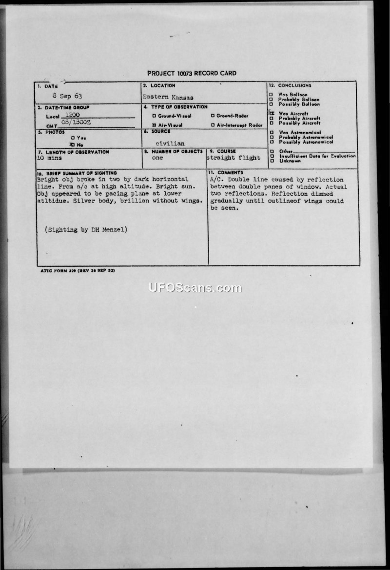 This document contains a Project 10073 record card and a personal account regarding a 1963 UFO sighting in Kansas. The sighting was officially identified as an optical reflection caused by the aircraft's double-paned windows.