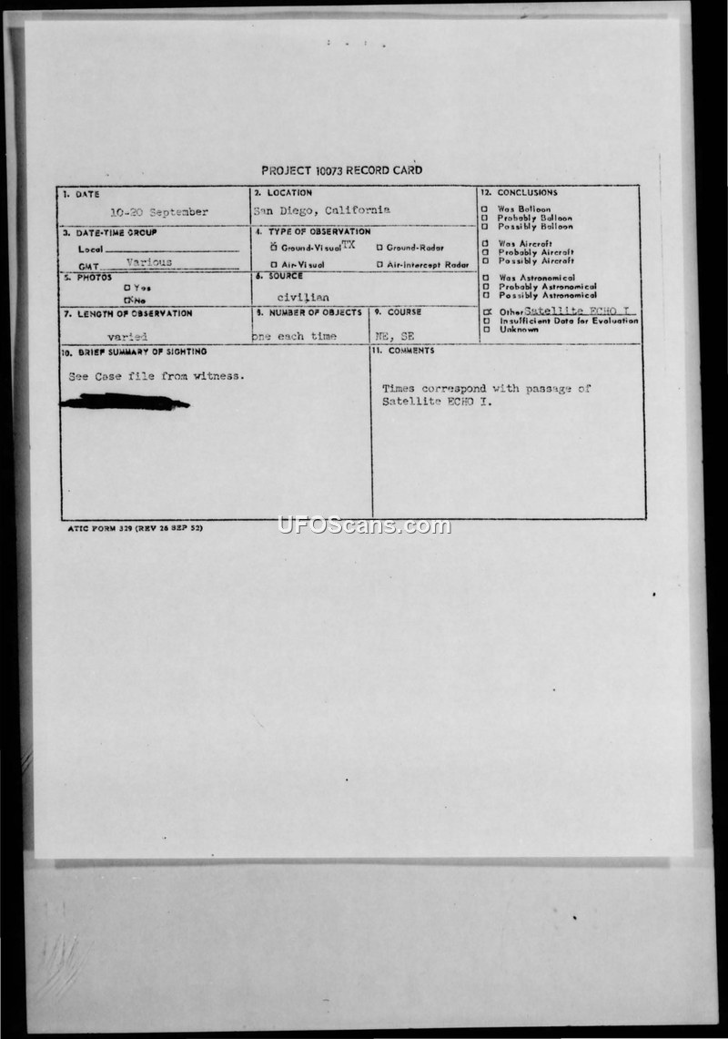 An amateur astronomer in San Diego reported UFO sightings in September 1963. The Air Force determined the object was the ECHO I satellite and attributed the witness's observations of erratic movement to optical phenomena.