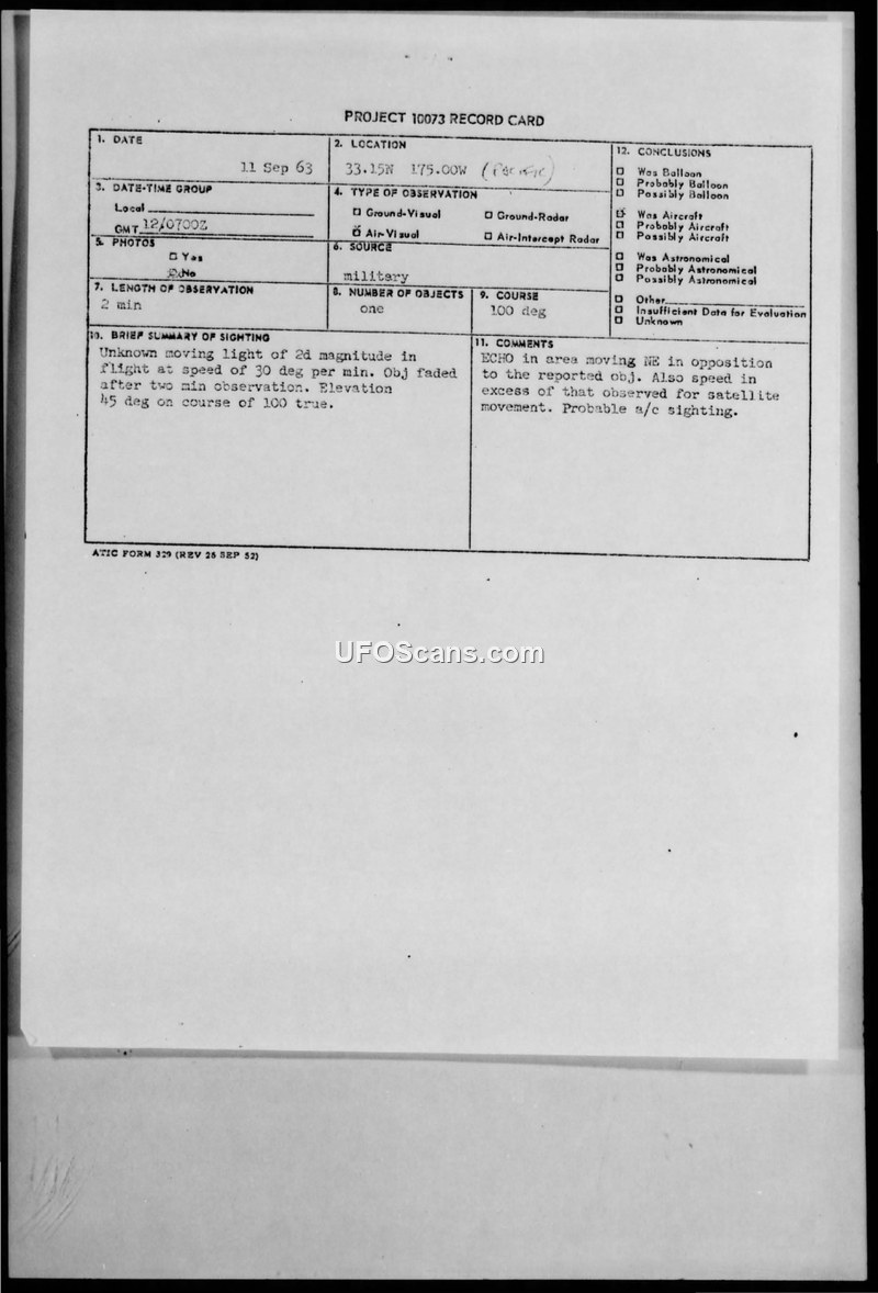 A CIRVIS report from 11 September 1963 describes an unidentified light in the Pacific. Military evaluators concluded it was likely an aircraft sighting.