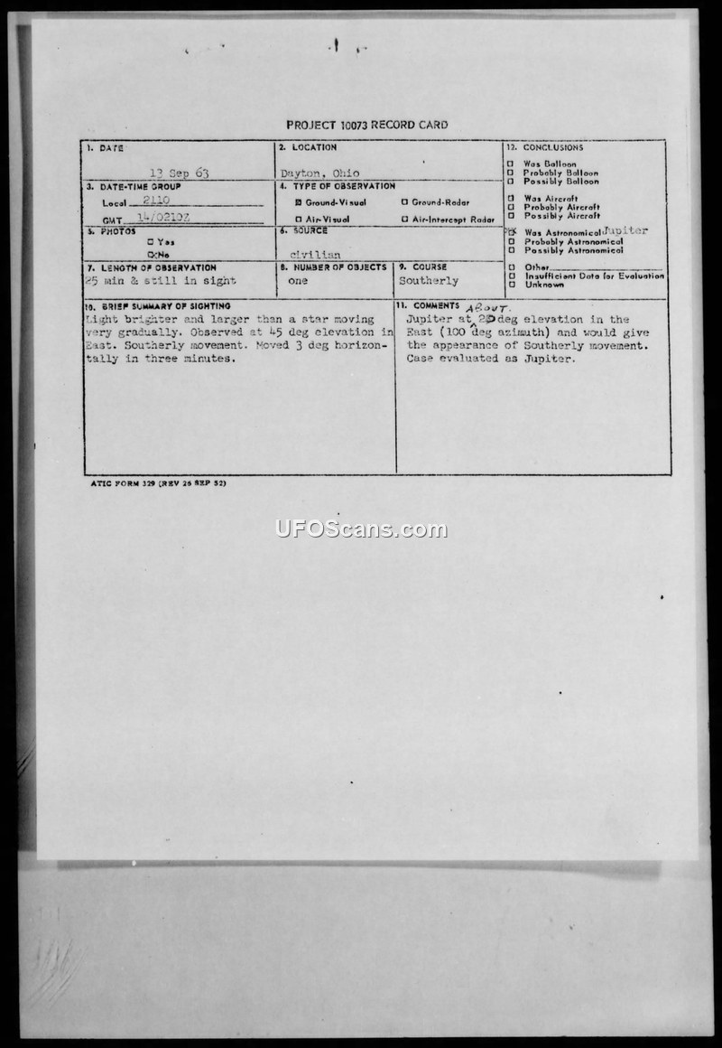 Two sighting reports from Dayton, Ohio, in September 1963 were investigated by the Air Technical Intelligence Center. The sightings were officially identified as the planet Jupiter and a meteor, respectively.