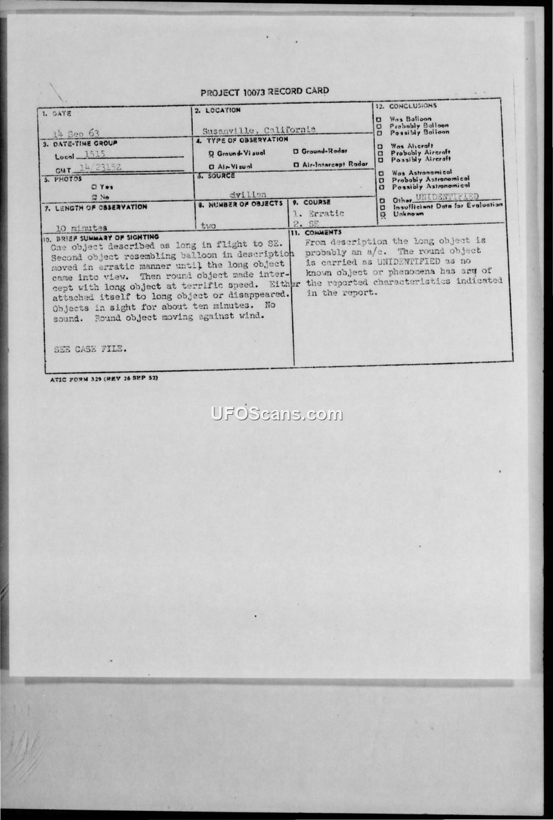 Project 10073 Record Card — Sighting Report, Susanville, California, 14 September 1963