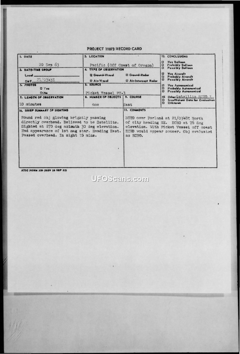 This document consists of a Project 10073 record card and an associated incoming staff message from the Department of the Air Force, dated September 21, 1963. The report details a sighting of an unidentified aerial object by the crew of Picket Vessel PV-3, located off the coast of Oregon at 45 degrees 22 minutes North, 135 degrees 34 minutes West. At 0343Z on September 20, 1963, the crew observed a round, red, glowing object that appeared to be a first-magnitude star. The object was sighted at an azimuth of 270 degrees and an elevation of 30 degrees, moving in an easterly direction. The observation lasted for approximately 10 minutes, during which the object passed directly overhead. The staff message further notes that other communication stations and a Flying Tiger aircraft pilot also reported observing the object. The pilot, flying north over Ukiah, California, described the object as appearing in front of him before dropping straight down, noting that it was bright enough to light up the entire sky. Following an evaluation of the data, the official conclusion reached by the Air Technical Intelligence Center (ATIC) was that the object was the ECHO satellite, which was calculated to be over Portland at 0348Z, heading southeast. The report notes that the Picket Vessel's position off the coast would have caused the satellite to appear sooner than it would have from a land-based observation point.