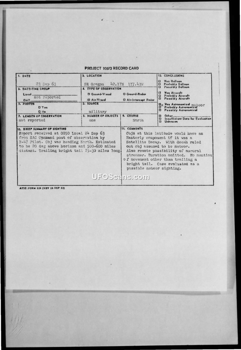 This document consists of a Project 10073 Record Card and an accompanying UFO report regarding an incident that occurred on September 23, 1963. The report was received via telephone at 0050 local time on September 24, 1963, from Sergeant Rummelt at the Air Force Command Post. The primary witness was Major Stanfell of the SAC Command Post, who relayed information from the pilot of a B-47 aircraft stationed at Mountain Home Air Force Base (callsign DIAL 32). The pilot reported observing an unidentified object at coordinates 42.17N 117.43W in Southeast Oregon. The object was described as heading north, positioned approximately 20 degrees above the horizon, and estimated to be 500 to 600 miles distant. A notable feature of the object was a bright, trailing tail estimated to be 25 to 30 miles long. The official evaluation, conducted by ATIC, concluded that the object was likely an astronomical meteor. The investigators explicitly ruled out satellite decay, noting that an object at that latitude would have exhibited an easterly component if it were a decaying satellite. A remote possibility of an auroral streamer was also considered, but the final determination remained that of a possible meteor sighting. The report notes that no other details were provided by the witness.