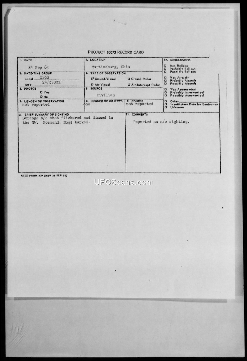 A civilian reported a silent, flickering object in the sky over Martinsburg, Ohio, in September 1963. The Air Force investigated the report under Project 10073 and concluded it was likely a high-altitude air refueling mission.