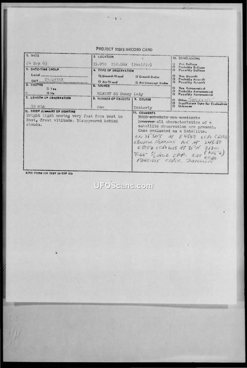 The SS Sunny Lady reported a high-speed bright light in the Pacific on September 24, 1963. The Air Force investigation concluded the object was a satellite.