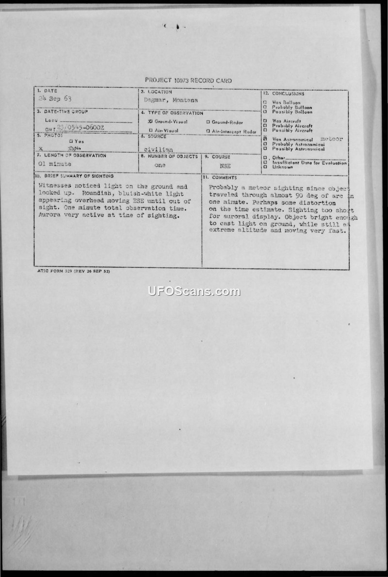 On September 24, 1963, three civilian witnesses in Dagmar, Montana, observed an unidentified aerial phenomenon. The witnesses, including a minister, reported seeing a roundish, bluish-white light that appeared overhead and moved in an east-southeast direction. The object was described as being bright enough to cast light on the ground despite being at an extreme altitude. The total duration of the observation was one minute, during which the object traveled through approximately 90 degrees of arc. The report notes that the aurora borealis was very active at the time of the sighting. Official military assessment, documented on an ATIC record card and via a staff message from the 780th Radar Squadron at Fortuna AFS, concluded that the object was likely a meteor. The investigators suggested that the short duration of the sighting made it unsuitable for an auroral display and noted that the witnesses' time estimate might have been subject to distortion.
