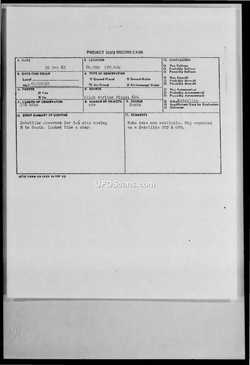 On September 30, 1963, at 010606Z, the crew of Slick Airline Flight 604 reported observing an unidentified object while at coordinates 20.20N 172.40W. The observation lasted for approximately five to six minutes. The witness, identified as Girvis, described the object as appearing like a star and moving from the north to the south. The report was transmitted via a Department of the Air Force staff message to various military commands, including CINCPACFLT, CINCNORAD, and PACAF, with an advance copy sent to the CIA and DIA. The official evaluation conducted by ATIC concluded that the object was a satellite and explicitly noted that it was 'NOT A UFO.' Echo data was reported as unavailable for the sighting.
