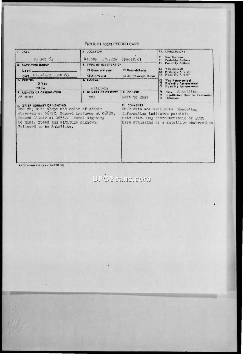 This document consists of a Project 10073 record card and associated military staff messages regarding a sighting on September 30, 1963, in the Pacific region at coordinates 47.50N 172.20W. A single glowing object was observed for a duration of 26 minutes, moving from west to east. The witness reported that the object's size, shape, and color were comparable to the star Altair. The object was noted to have passed the star Arcturus at 0648Z and Altair at 0655Z. The speed and altitude of the object remained unknown. The sighting was reported via the CIRVIS (Communications Instructions for Reporting Vital Intelligence Sightings) system. The evaluating unit, ATIC, noted that while specific ECHO satellite data was unavailable, the characteristics of the object suggested it was a satellite. The report was distributed to various military and intelligence agencies, including the CIA and DIA, for further awareness.