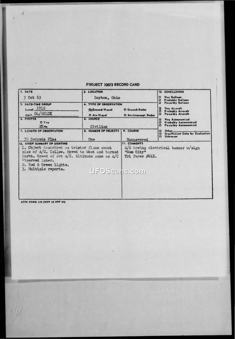 This document contains a series of Project 10073 Record Cards and associated technical information questionnaires documenting multiple sightings of unidentified aerial phenomena in the Dayton, Ohio area during October 1963. The reports detail various observations made by civilians. The first major incident, reported on October 3, 1963, involved an object described as a 'twisted flame' about the size of an aircraft, yellow in color, with red and green lights. The object was observed moving north and maneuvering. Subsequent investigation revealed this to be a Tri Pacer aircraft (tail number #6LX) towing an electrical advertising banner reading 'Gem City'. Other reports in the file include a flash of light on October 6, 1963, which was determined to be a meteor; observations of a bright object in the east between October 8 and 10, 1963, identified as the planet Jupiter; and a report on October 10, 1963, of an object moving through the sky, which was identified as the ECHO I satellite. The documentation includes handwritten notes from witnesses, sketches of the objects' paths, and technical data sheets regarding the visibility of the ECHO I satellite over Dayton during that period. The files reflect the standard procedure of the Aerial Phenomena Branch to collect civilian reports and cross-reference them with known astronomical, meteorological, and aviation data to provide conventional explanations.
