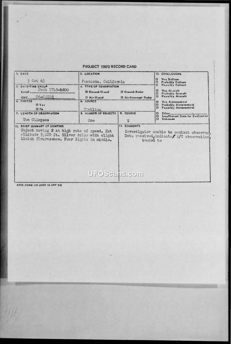Project 10073 Record Card and Report of Unidentified Flying Object (UFO) — Pasadena, California, 5 October 1963