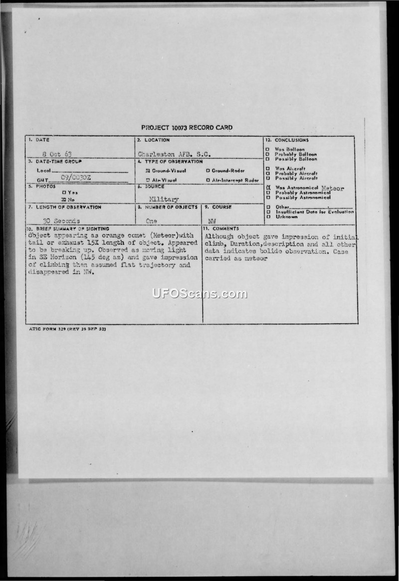 A sighting of an orange, comet-like object was reported at Charleston AFB on October 8, 1963. The military investigation concluded the object was an astronomical meteor (bolide).