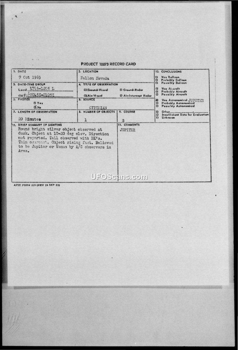 On 9 October 1963, a control tower operator at Fallon Naval Air Station in Nevada observed a bright, silver, round object at dusk. The object, which appeared to be the size of a dime, was initially mistaken for an inbound aircraft. The witness, using binoculars, noted that the object had a faint tail, possibly with two lights at the end, and was rising from 10 to 20 degrees above the horizon over a 20-minute period. The object moved slowly toward the south before disappearing behind a thin layer of clouds. Radar sites at Tonopah, Fallon, and Winnemucca confirmed the presence of a light on the eastern horizon. A flight of four US Navy aircraft was operating in the area at the time; one pilot, LT W. Spear, observed the object and identified it as Venus. Another pilot, LT Commander Charles G. Harnden, pursued the light briefly before concluding it was a planet. Major Donald E. Post, the investigating officer from Stead AFB, concluded that the object was the planet Jupiter. He noted that the presence of a cloud layer at altitude created an illusion of motion, which confused the observers. No other reports of the object were received, and the investigation was closed with the determination that the sighting was an astronomical event.