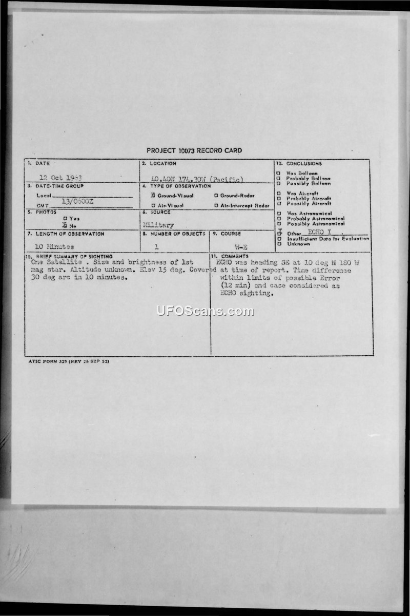 A 1963 military report documents a sighting of an object in the Pacific, which was officially identified as the ECHO I satellite. The report was processed through standard CIRVIS reporting channels.