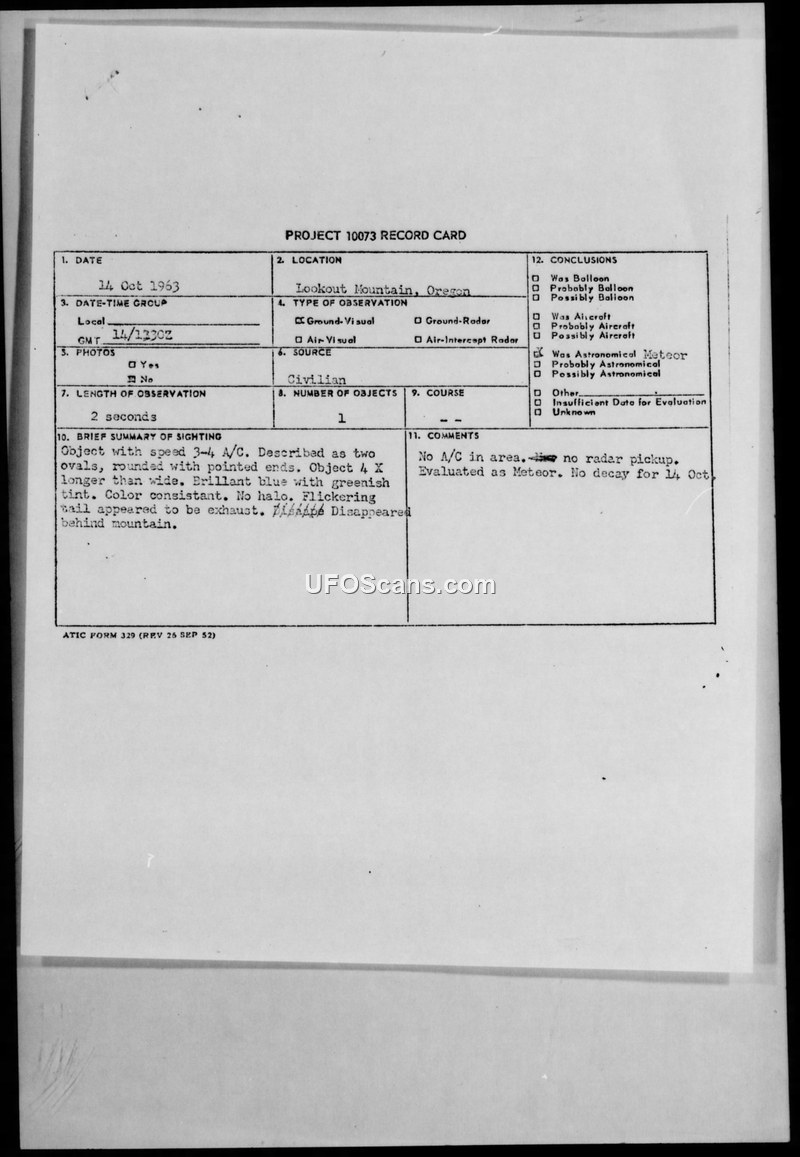 Project 10073 Record Card — Lookout Mountain, Oregon, 14 October 1963
