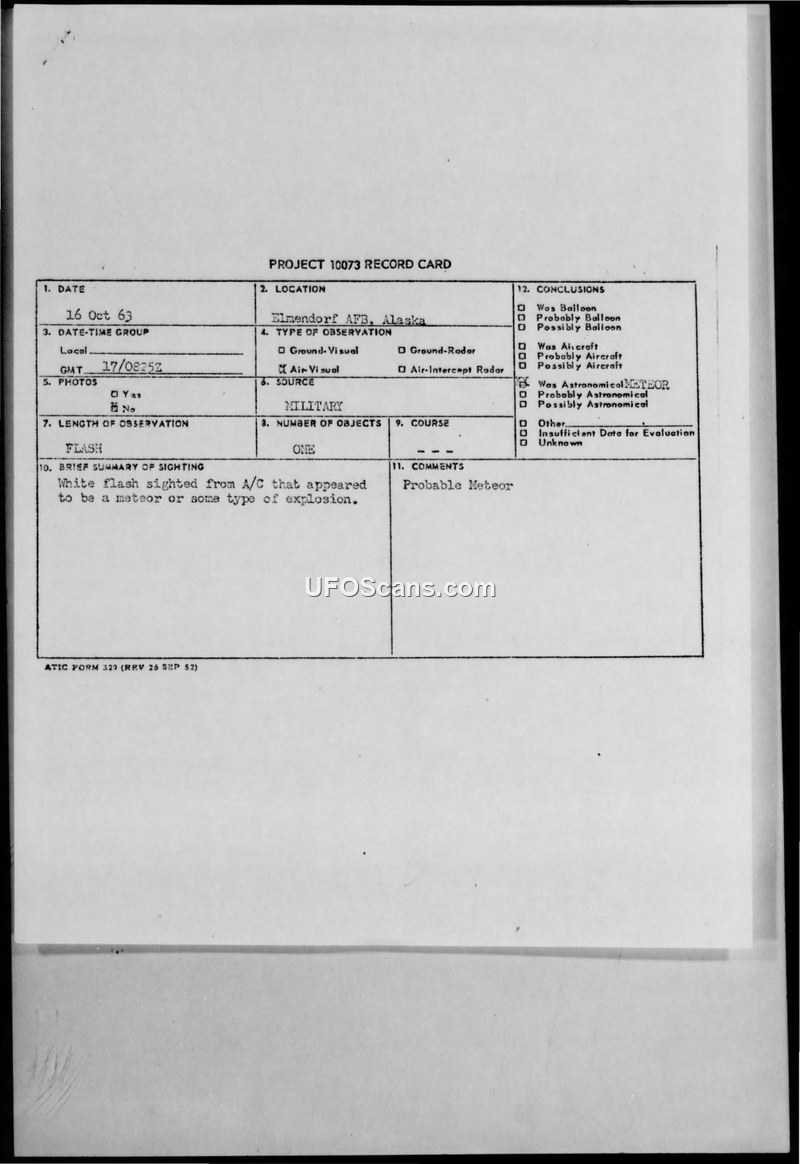 On October 16, 1963, at 0825Z, a white flash was observed by an aircraft (identified as 61 C123) 15 miles northwest of Elmendorf Air Force Base, Alaska. The sighting occurred at a high altitude above 3,000 feet. The phenomenon was described as appearing to be a meteor or some type of explosion. The incident was documented on a Project 10073 record card and reported via a staff message from the Air Force. The official conclusion reached by the evaluating agency, ATIC, was that the object was a 'Probable Meteor'. The message was distributed to various military commands, including INCNORAD, INCSAC, and USARAL, and copies were delivered to the DIA, NIN, and XOPX, with the message also being retransmitted to the CIA.