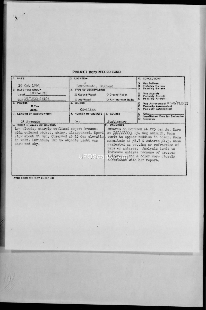 A civilian in Bournemouth, England, reported a stationary, luminous object on October 19, 1963. The Air Force investigated and concluded the sighting was an astronomical event, likely the star Antares or the planet Mars.