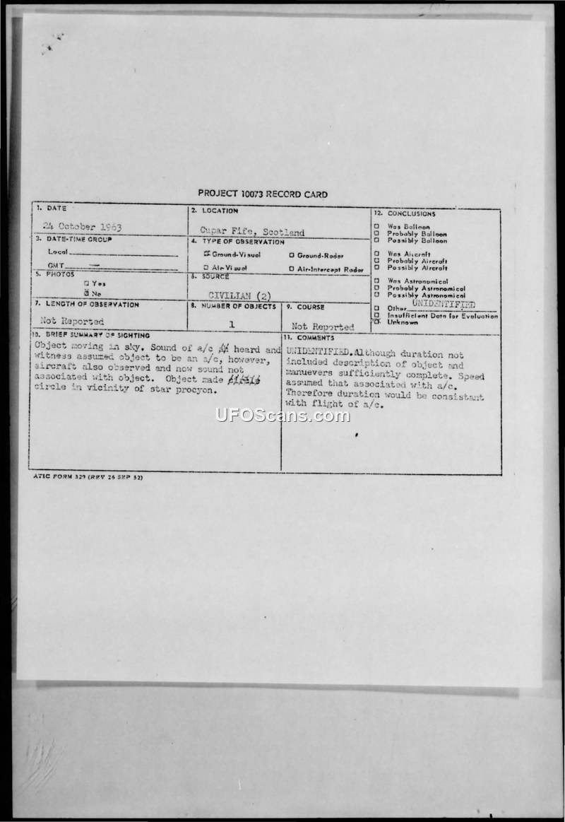 A 1963 sighting in Cupar Fife, Scotland, was reported to the U.S. Air Force. The object remained unidentified, and the report was subsequently used by the Air Force as an example of a high-quality sighting report in a public brochure.