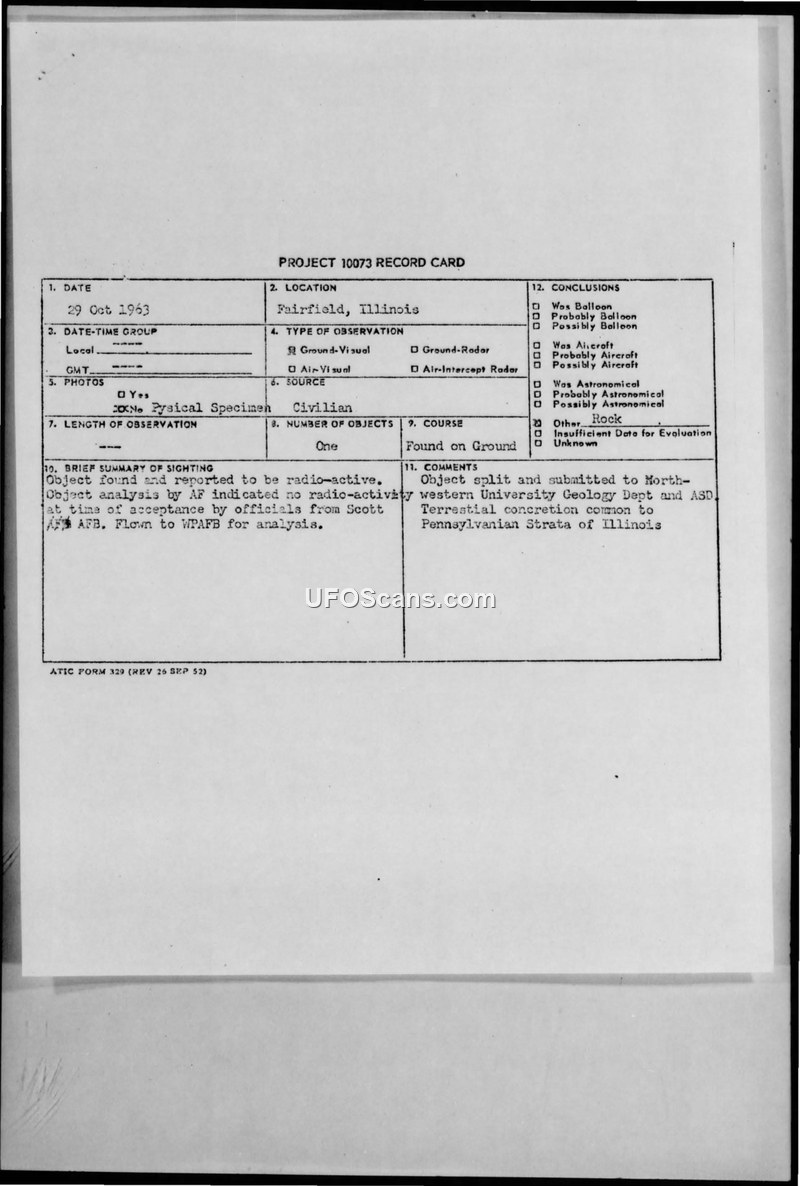 An object found in Fairfield, Illinois, in 1963, initially suspected of being radioactive and of potential extraterrestrial origin, was analyzed by the Air Force and Northwestern University. It was definitively identified as a common terrestrial clay-ironstone concretion.
