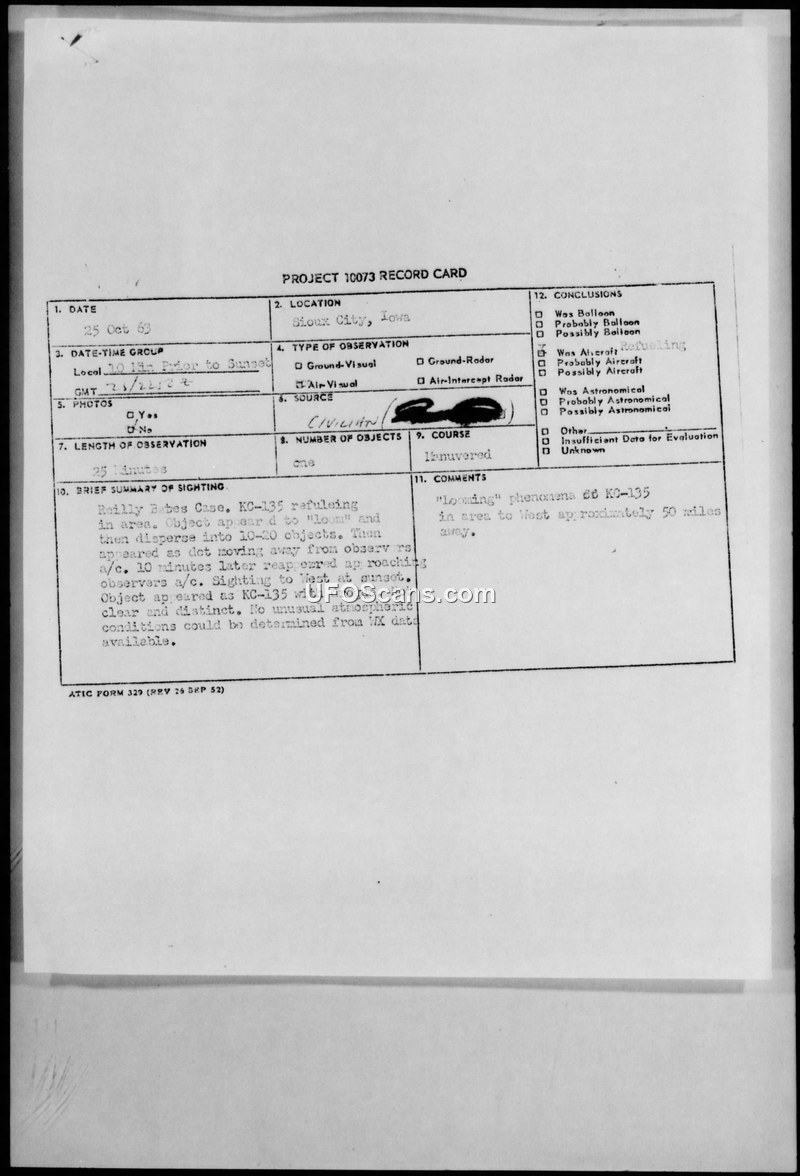 Project 10073 Record Card: Sioux City, Iowa, 25 Oct 63