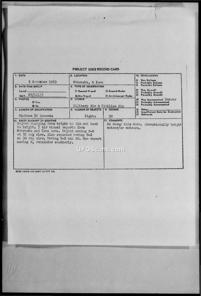 Project 10073 Record Card — Nebraska & Iowa, 5 November 1963