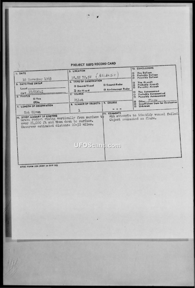 On November 16, 1963, at 0204Z, the pilot of a BOAC Speedbird 492 flight reported a sighting of a green rocket over the Atlantic Ocean at coordinates 38.5N 72.5W. The pilot observed the object rising vertically from the surface to an altitude exceeding 21,000 feet before descending back to the surface. The observer estimated the distance of the object to be between 20 and 30 miles. A subsequent investigation, which included checking with other aircraft on station, yielded no other sightings of the object. The official conclusion reached by the Air Technical Intelligence Center (ATIC) was that the object was a flare, noting that all attempts to identify the vessel involved had failed.