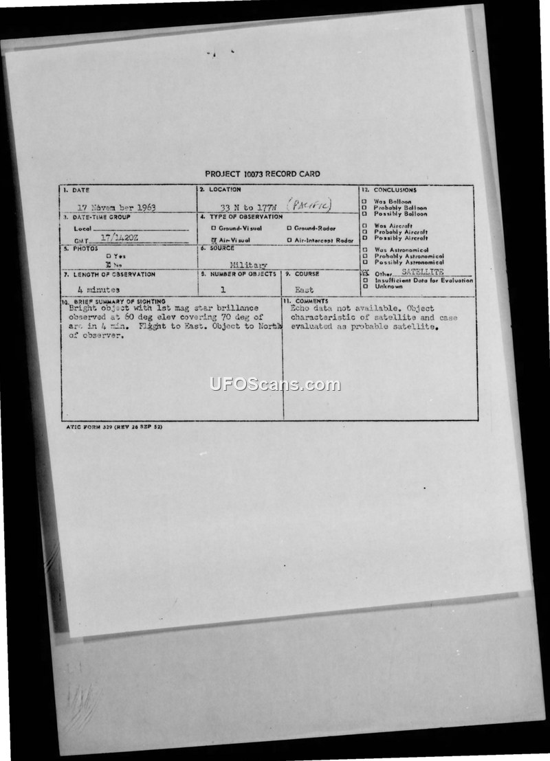 On 17 November 1963, a military report was filed regarding a sighting of an unidentified object in the Pacific region at coordinates 33 N 177 W. The object was observed for a duration of four minutes, beginning at 17/1420Z. Witnesses described the object as having the brilliance of a first-magnitude star. It was observed at an elevation of 60 degrees, covering 70 degrees of arc while maintaining a flight path toward the East. The sighting was reported via the CIRVIS (Communication Instructions for Reporting Vital Intelligence Sightings) system. Multiple military commands were notified of the event, including PACAF, CINCPAC, and various intelligence agencies. The official evaluation, documented on a Project 10073 record card, noted that while echo data was unavailable, the object's characteristics were consistent with those of a satellite, leading to a conclusion that it was a probable satellite.
