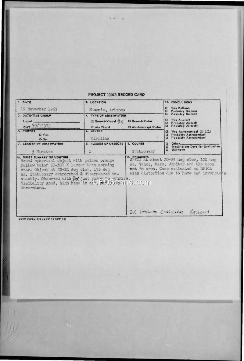 On 19 November 1963, a psychiatrist in Phoenix, Arizona, reported observing a spherical, golden-orange object for five minutes. The witness, whose identity is partially obscured in the record, observed the object using both the naked eye and 6x30 binoculars. The object was described as being the size of a pinhead but 50 to 100 times larger than a morning star. It remained stationary before appearing to evaporate or disappear. The sighting occurred between 191333Z and 191337Z. Major William C. Harrelson of the 4516 Combat Crew Training Squadron investigated the report. He noted that the observer sounded mature, reliable, and sincere. Despite this, the official conclusion reached was that the object was the star Spica, with its appearance distorted by high haze and three distinct temperature inversions present in the area at the time. Radar checks by the Phoenix Air Defense Sector returned negative results, and no other military or civilian air traffic was reported in the vicinity.