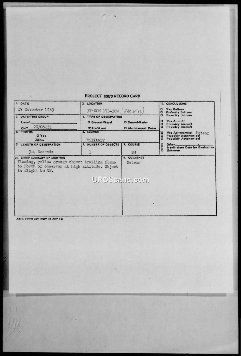 On 19 November 1963, at 20:06:25Z, a sighting of an unidentified aerial phenomenon was reported in the Pacific region at coordinates 37-00N 173-30W. The report, filed under Project 10073 and processed as a CIRVIS report (NAVY 43200), describes a single object that was yellow-orange in color and trailing a flame. The object was observed for a duration of three to four seconds at an extremely high altitude, traveling in a southwest direction. The sighting was reported by military personnel. The official conclusion reached by the Air Technical Intelligence Center (ATIC) was that the object was a meteor. The documentation includes a Project 10073 record card and a staff message from the 326 Air Division Kunia Facility in Hawaii, which was distributed to various military commands including CINCPAC, CINCSAC, and the CIA.