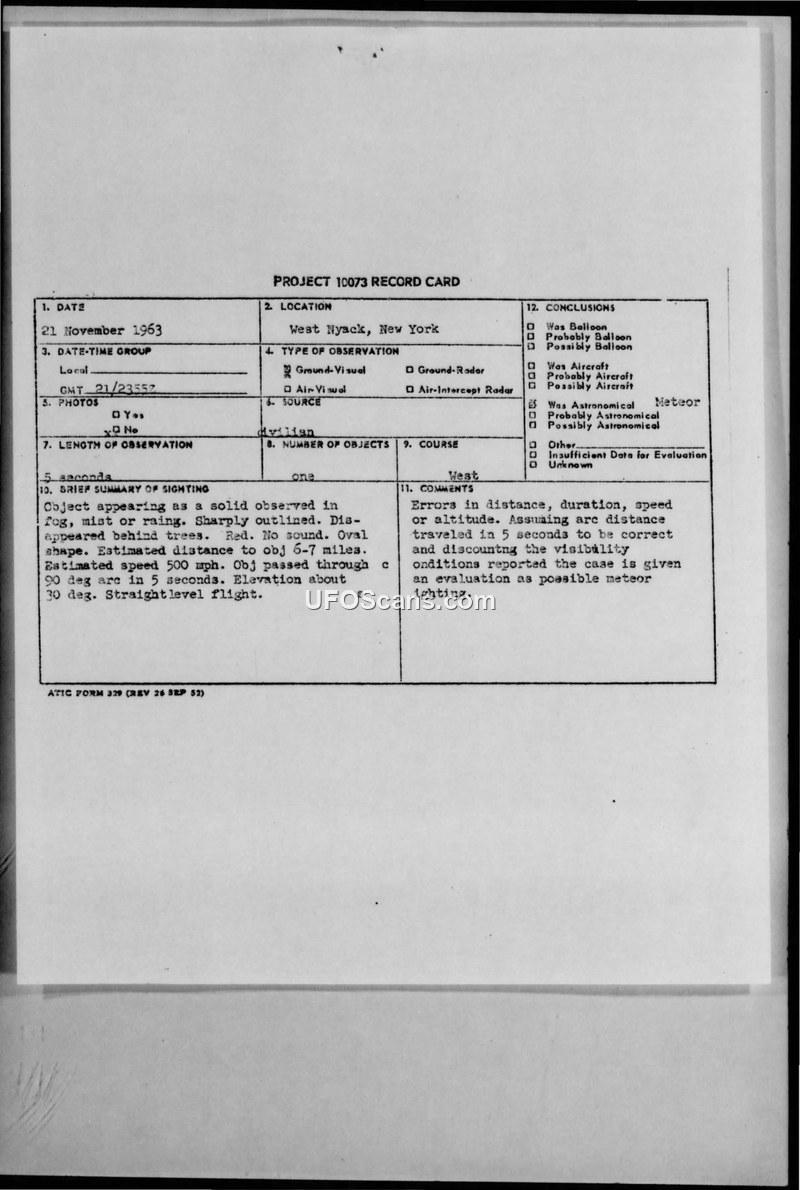 Project 10073 Record Card — West Nyack, New York, 21 November 1963