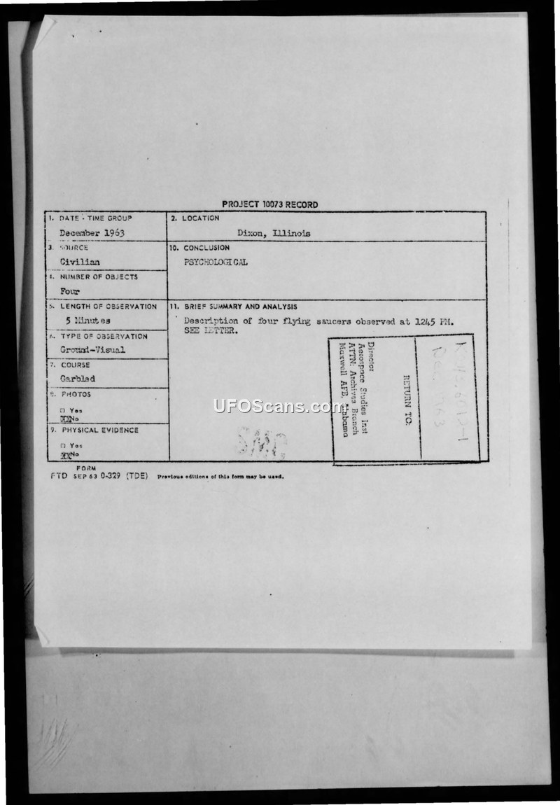 A civilian in Dixon, Illinois, reported a sighting of four flying saucers in December 1963. The Air Force officially categorized the incident as 'Psychological' and informed the witness that no evidence of extraterrestrial activity had been found in their investigations.