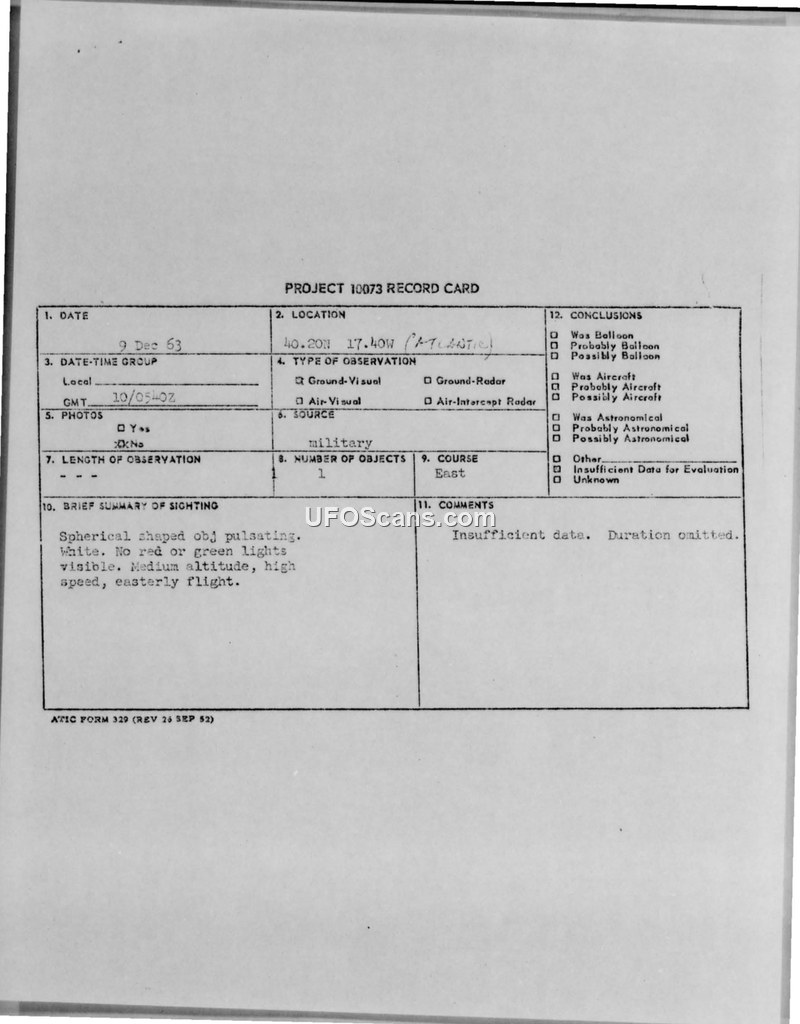 Project 10073 Record Card - Sighting of 9 Dec 63