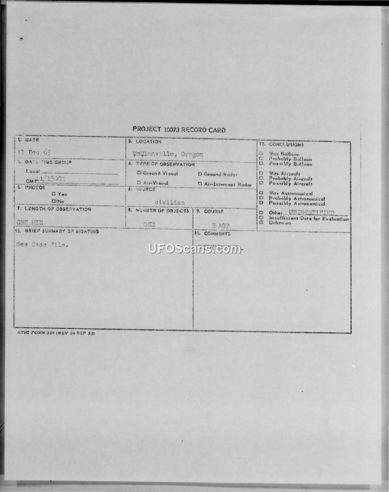 UFO Sighting, McMinnville, Oregon, 11 Dec 63