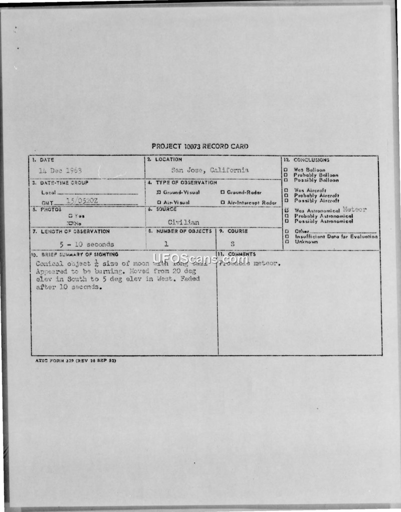 Project 10073 Record Card and UFOB Report — San Jose, California, 14 December 1963