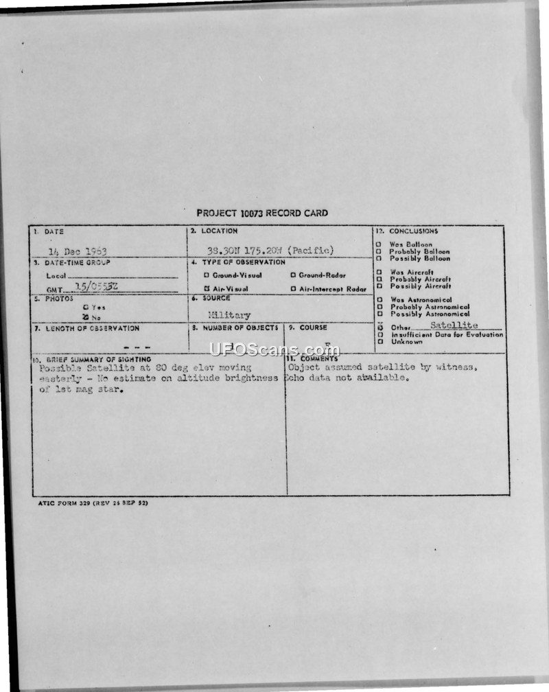 On December 14, 1963, at 0553Z, a sighting of an unidentified object was reported in the Pacific region at coordinates 38.30N 175.20W. The report was processed through military channels as a CIRVIS report (Communication Instructions for Reporting Vital Intelligence Sightings). Three observers reported seeing an object moving in an easterly direction at an elevation of 30 degrees above the horizon. The object was described as having the brightness of a first-magnitude star. The military investigation, documented on a Project 10073 record card, concluded that the object was a satellite, noting that the witness assumed it was a satellite and that specific Echo data was not available for confirmation. The report was distributed to various military commands, including CINCNORAD, CINCPAC, and the CIA, and was marked as unclassified.
